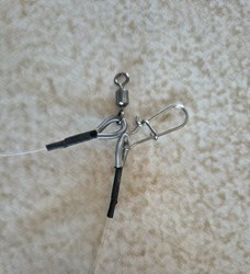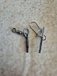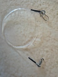 Luxe fluorcarbon onderlijn. Fijn. Gemaakt van 100% Amerikaans fluor carbon. 75/100 dik, en dus bestand tegen de meeste tanden. het fluorcarbon heeft een trekkracht van 70 LB. uitgevoerd met een handige fast lock speld. De lengte van de onderlijn is ongeveer 60 cm. Deze extra lengte zorgt voor meer veiligheid, bij draaiende snoek. De sleeve is voorzien van krimpkous, en de bocht in het draad is voorzien van verenstaal. De wartel is een versterkte versie, maat 2.